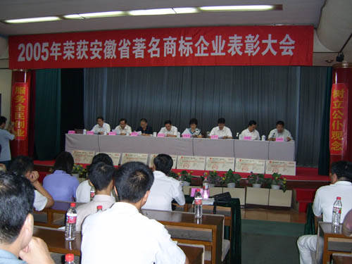 2006年7月26日下午,馬鞍山市2005年獲省著名商標(biāo)企業(yè)表彰大會(huì)在市政府東二樓會(huì)議室舉行,出席本 次會(huì)議的主要領(lǐng)導(dǎo)有省工商局副局長黃家華、市人大常委會(huì)副主任杜永田、市政府副市長劉榮華、市政協(xié) 副主席孫文植、市政府副秘書長王興無、省工商局商標(biāo)局局長劉國建等。