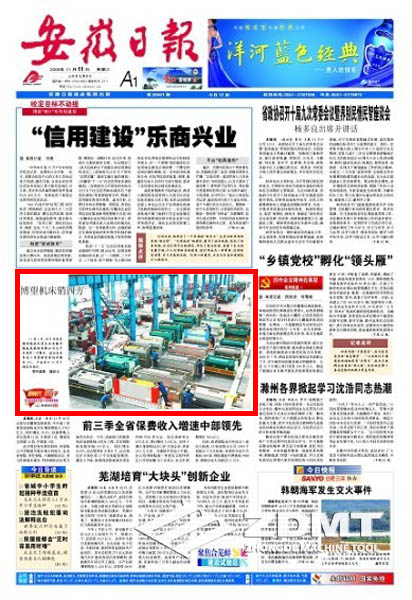 今日(2009年11月11日)《安徽日報》頭版刊載《博望機床銷四方》的圖片新聞報道。在我公司大型車間圖片中,配出如下文字報道:11月6日,位于當(dāng)涂縣博望鎮(zhèn)的民營企業(yè)安徽中德機床股份有限公司生產(chǎn)車間里一片繁忙。該企業(yè)今年前三季度銷售量同比增長35%,產(chǎn)品出口30多個國家和地區(qū)。(特約攝影 謝富樂)